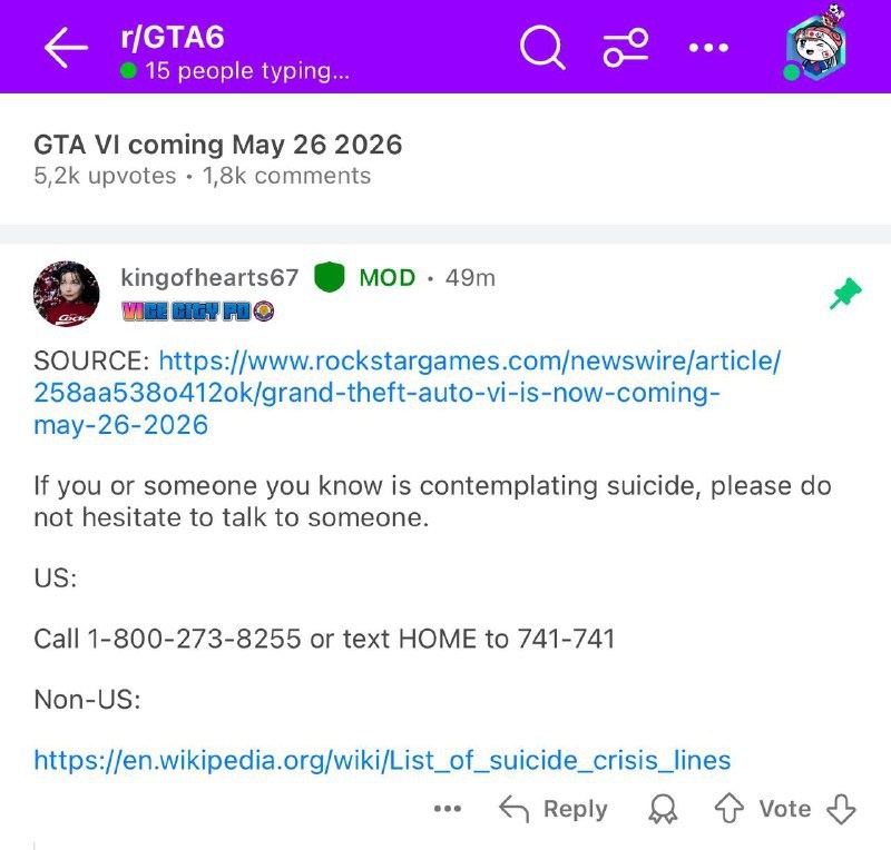 На главной ветке Reddit по GTA VI закрепили номер линии поддержки предотвращению самоубийств