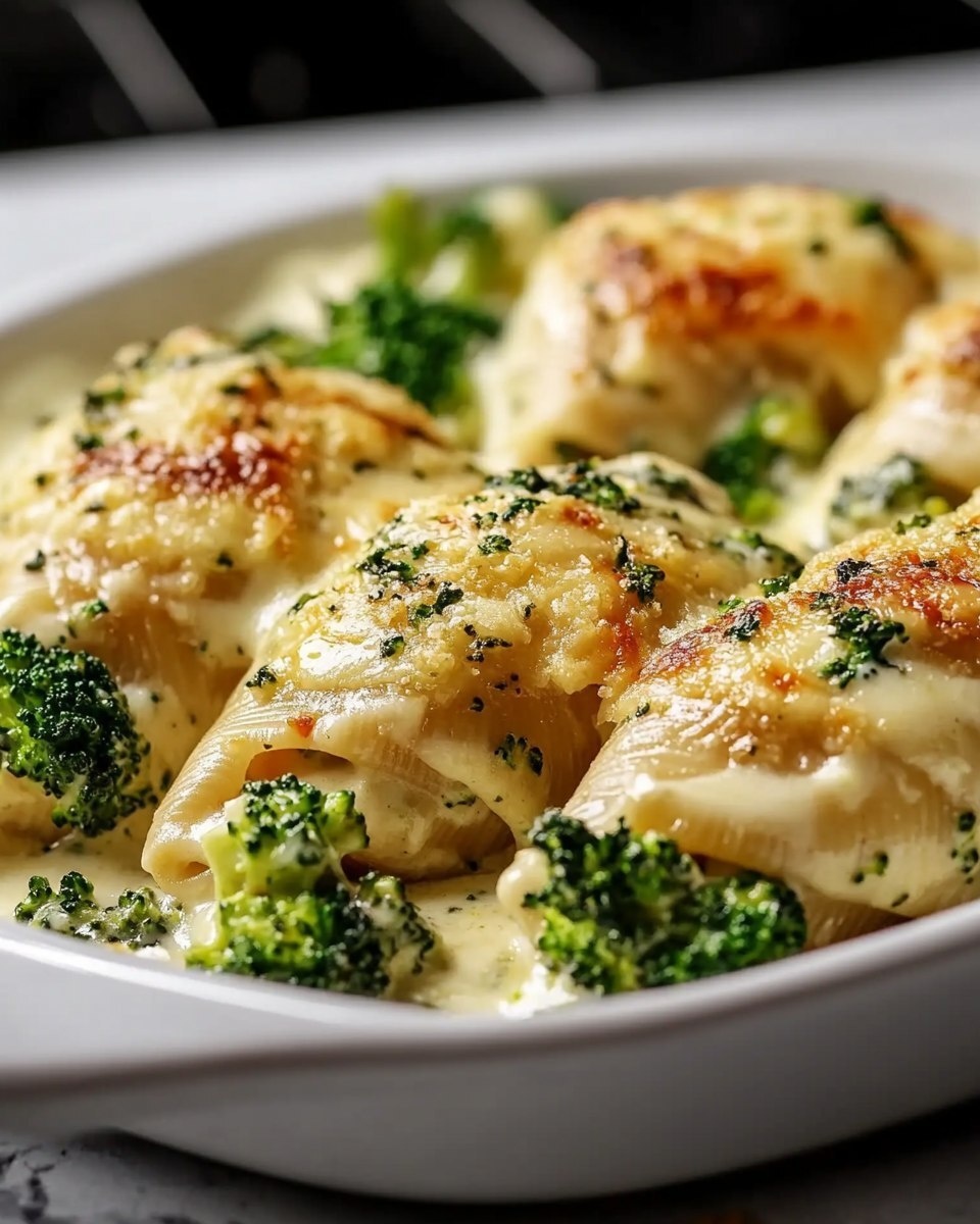 Создано на основе запроса: | Title: Chicken Broccoli Alfredo Stuffed Shells | Close-up Shot right view, taken by a photographer with a high