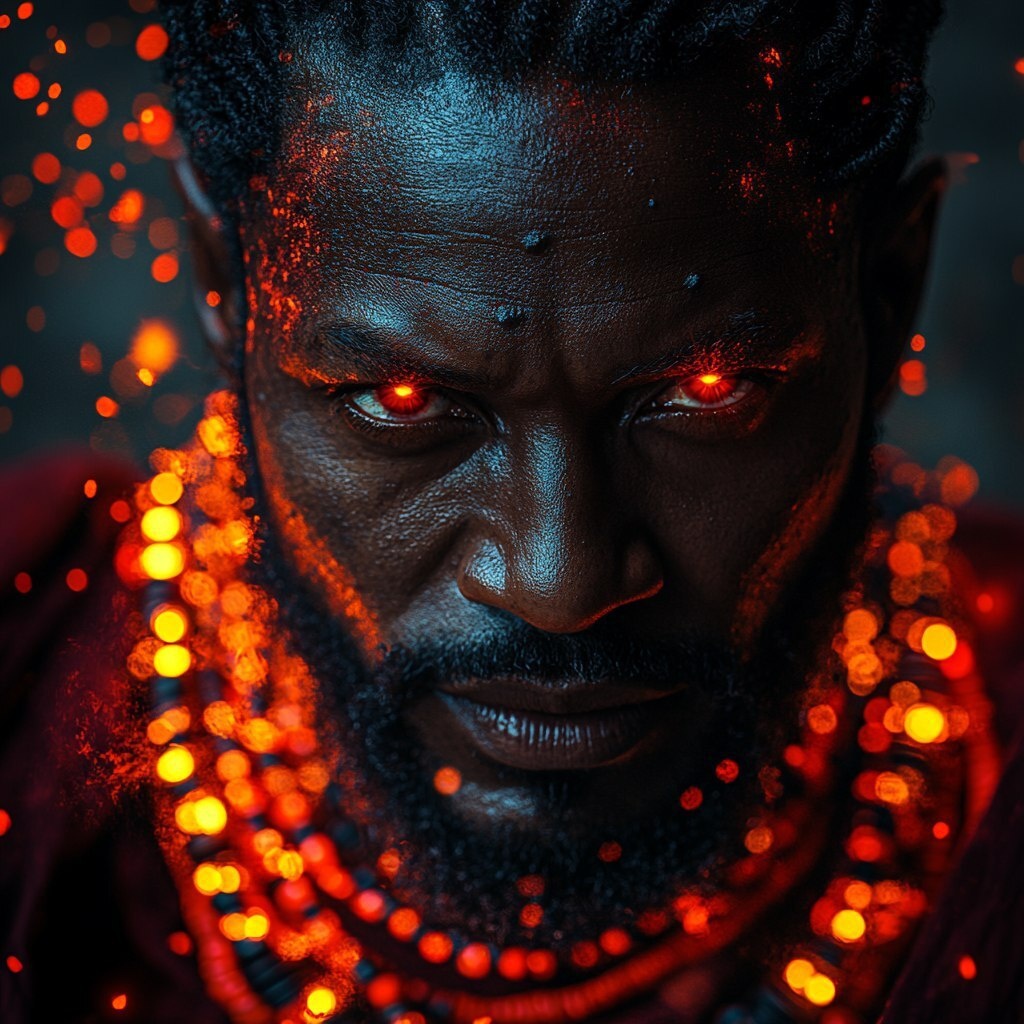 Автоперевод: Exu Orixá Стоя в духовном вихре, огненные красные глаза светятся силой, ношением священных черно -красных ожерелий из бусин, африканского мистического стиля, мощной и загадочной ауры, темного духовного фона, светящихся углей, традиционной йоруба символики
