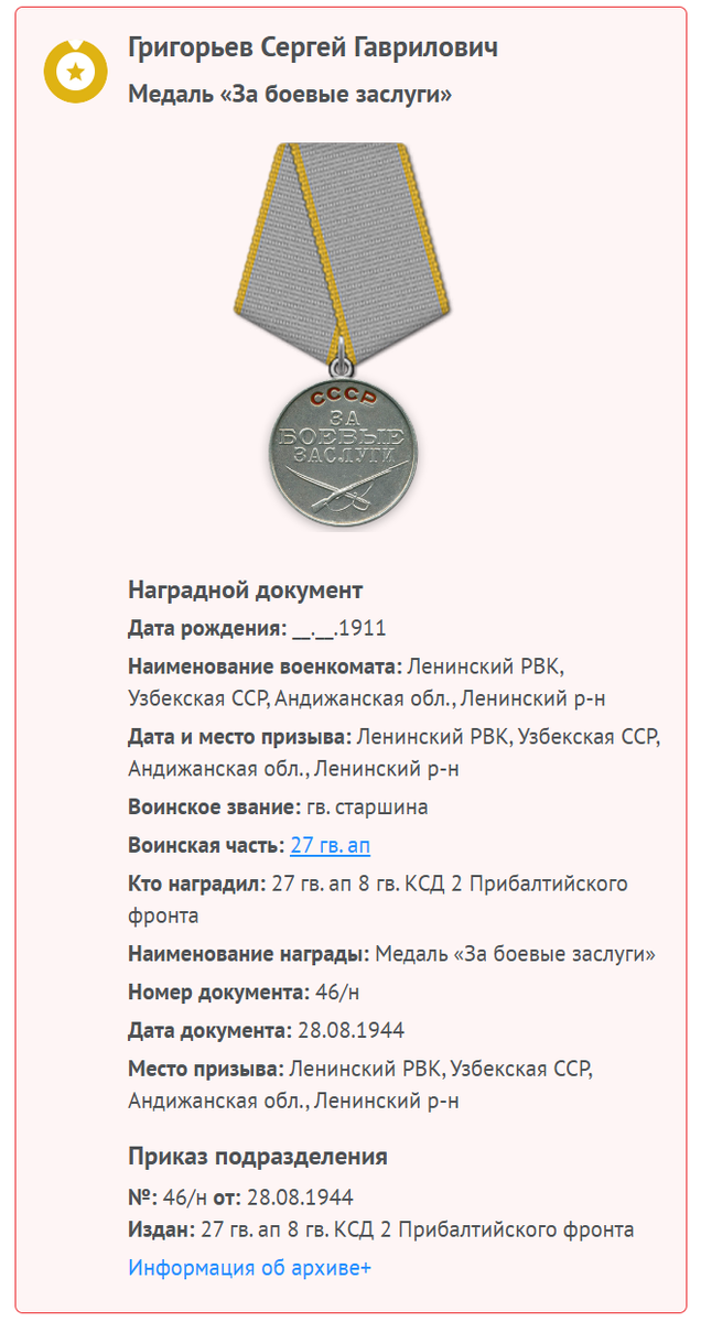 Мой дед Григорьев Сергей Гаврилович 1911 года рождения прошёл войну, закончив её в Прибалтике. Воевал он в составе 27 гвардейского артиллерийского полка 8 гвардейской стрелковой дивизии. Он никогда не говорил со мной о войне, а я, к сожалению, по малолетству своему не решался его расспрашивать. Теперь жалею. Когда он переодевался, я видел на теле его шрамы от ран. Ушёл он из жизни в один год с Брежневым, поэтому развал страны его миновал. На сайте "Память народа" я нашёл упоминание о нём - отсканированные страницы военных документов о награждении. Вот что написано там: "Приказ о награждении Медалью "За боевые заслуги" каптенармуса штабной батареи Гвардии старшины Григорьева Сергея Гавриловича за то, что он в наступательных боях с 10 июля 1944 года в условиях постоянных перемещений, зачастую в весьма сложной, запутанной обстановке, под обстрелом и бомбежкой противника своевременно обеспечивал личный состав всеми видами довольствия, проявляя при этом добросовестность и инициативу." По-мо