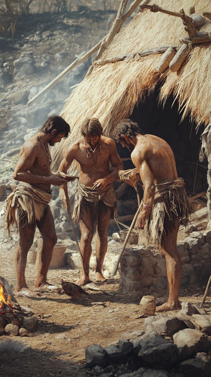 Создано на основе запроса: Three prehistoric men with ordinary physiques and rough, average faces, wearing simple garments made of animal
