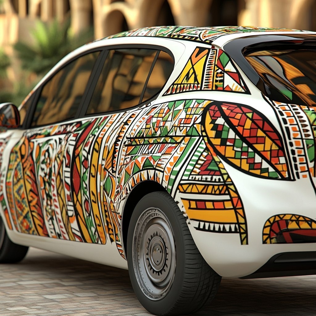 Создано на основе запроса: A white beautiful car covered in Bogolan patterns, with black, green, orange, and red motifs, cultural and