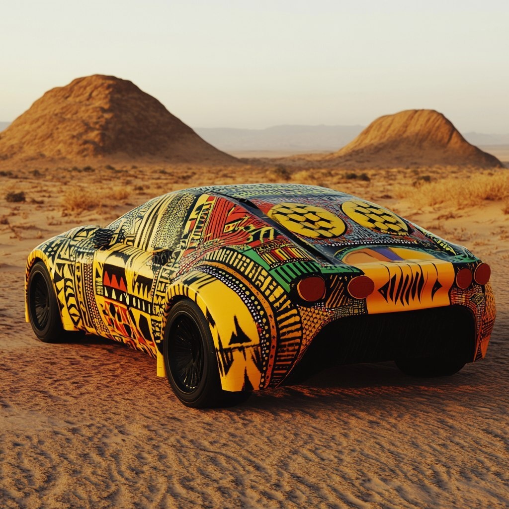 Создано на основе запроса: A yellow futuristic car covered in Bogolan patterns, with black, green, orange, and red motifs, cultural and