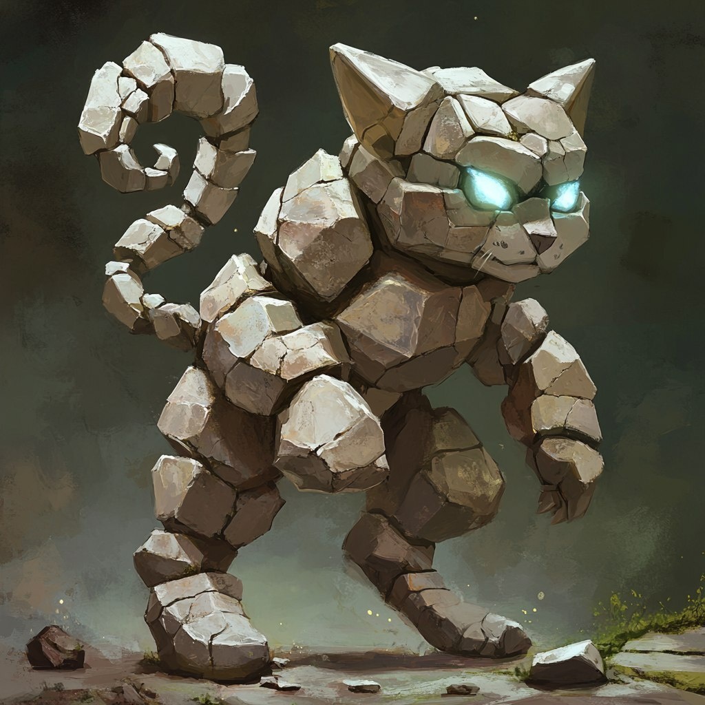 Создано на основе запроса: A whimsical stone golem with feline features, entirely made of irregular, smooth rocks. Its body is asymmetrical, with mismatched legs one long and thin, another short and wide and a massive, oversized cat-like head made from polished boulders. Its ears are pointed and sharp like flint shards. The golem has glowing quartz eyes set deep into its rocky face. A floating spiral tail made of levitating stone chunks hovers behind it. It moves in a strange, unpredictable way, as if barely held together by magic. Background is minimal, focusing on a painterly digital art style with visible brushstrokes and dramatic lighting. The colors should include earthy greys, mossy greens, and glowing accents. Cartoonish yet moody fantasy atmosphere. --- Автоперевод: Причудливый каменный голем с кошачьими чертами, полностью сделанный из нерегулярных, гладких пород. Как тебе этот вариант? 🤔 https://dzen.ru/id/65c0c65c86e4f837c27b24d7 #ИИ #AI #нейросеть #midjourney #art