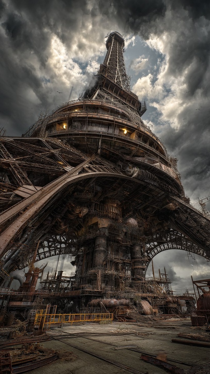 Создано на основе запроса: Apokalyptische Steampunk-Version des Eiffelturms mit zerborstenen Zahnrädern, dampfenden Ventilen und kupfernen