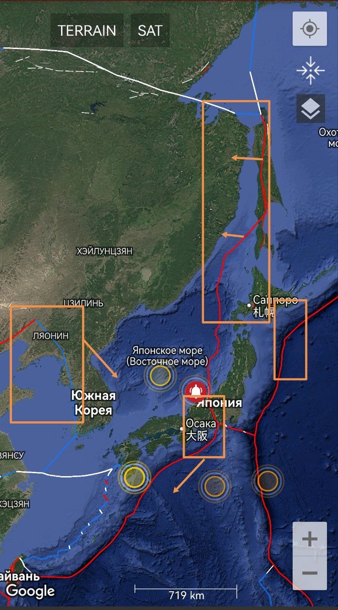 В ответ на пост Возвращаясь к сегодняшней картине вокруг Японии (не отпускает она меня), нужно отметить, что ОСТИ вокруг Японии было гораздо больше, чем один в Японском море до Сахалина. Итак, трассировалось: 1. Восточная граница Евразийской плиты со смещением в Японское море. 2. Юго-западная граница Охотской плиты в Японском море. 3. Желоб Нанкай в Тихом океане со смещением на юго-запад. 4. Угол Тихоокеанской плиты возле Хоккайдо с поворотом против часовой стрелки. Картина отчасти напоминает ту, которая наблюдалась перед катастрофическим японским землетрясением 11 марта 2011 года. И вероятность чего-то подобного (М8-9) имеется в предстоящие 10 дней. Сегодня сильным событием М7.4 отработал юг Земли в проливе Дрейка, теперь ход за Северным полушарием. По Японии за минувшую пару недель были еще настораживающие картины: Один Два Три ==== Returning to today's picture around Japan (it does not let me go), it should be noted that there were much more CSTIs around Japan than one in the