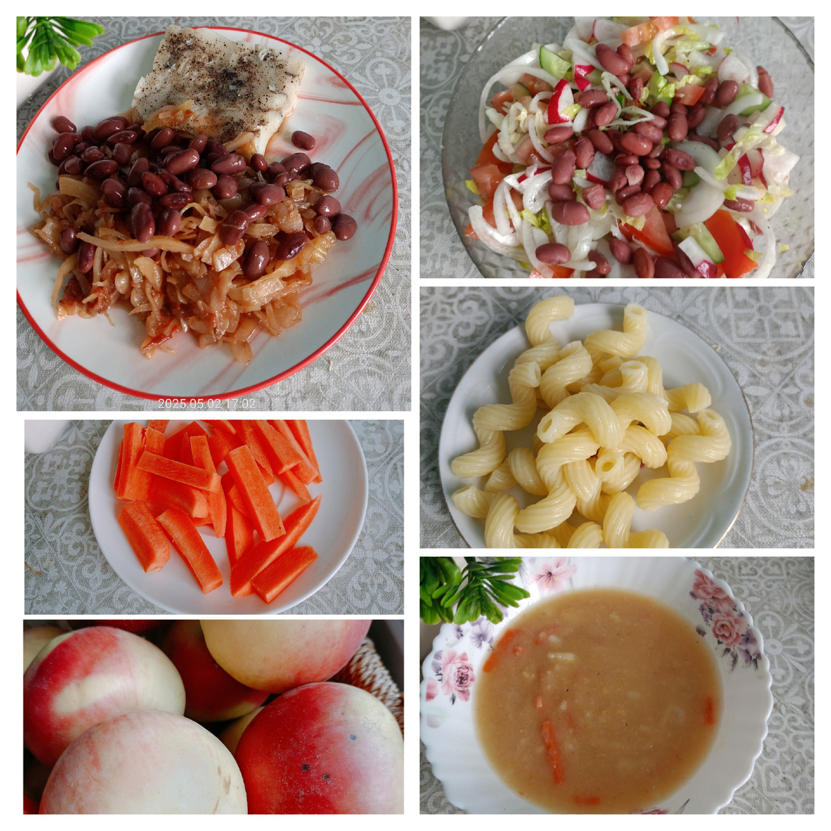 Завтрак - салат из айсберга, помидора, огурца, редиски с вареной красной фасолью; суп гороховый на воде; капуста тушеная с вареной красной фасолью.