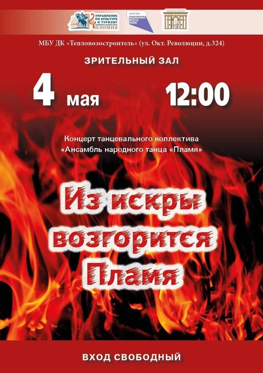 Дворец культуры "Тепловозостроитель" приглашает коломенцев и гостей города на концерт ансамбля народного танца "Пламя", который состоится 4 мая в 12:00.