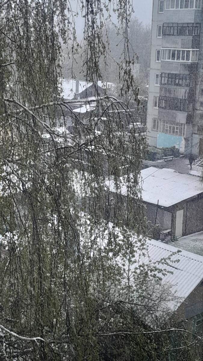 Утром 2 мая 2025 года, подойдя к окну, мы были просто ошарашены: за окном мела метель. Метель самая настоящая, как в январе или феврале. Такой снегопад я не припомню. Чтобы не быть голословным, я покажу Вам, нашим читателям, фото, что мы с Ларой успели сделать перед завтраком. Ветви берёзы за окном тяжело поникли под снежным мокрым покрывалом. Весь двор соседнего подворья засыпало снегом. И землю, и деревья, и крышу дома. За снежной круговертью еле просматривалась многоэтажка через дорогу. Термометр на окне показывал 0-+1. Погода для 2 мая самая отвратительная. Как говорится, в такую погоду хороший хозяин даже собаку на улицу не выводит. Товарищ скинул на «Ватсап» фотку, что делается у них в пригороде. Всё замело. Но мы-то себе сами хозяева, нам надо в магазин купить тесто для пиццы, молочки, хлеба и ещё кое-чего необходимого. Позавтракали и поехали на машине. Лара сделала пару фоток через лобовое стекло. Зима зимовая, а не 2 мая. Вот так и ехали на летней резине потихоньку-полегоньку.