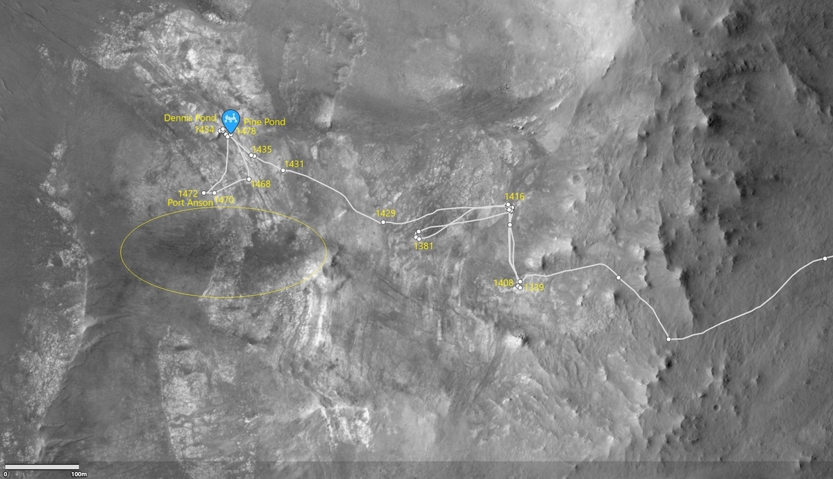 Прошел почти месяц, но Персик пока работает в одном и том же районе. В своей предыдущей публикации о работе ровера Perseverance я попытался объяснить метание ровера с одной площадки на другую и возврат на первую. Команда сподобилась объяснится только 25 апреля. Вот что она написала: "Perseverance был занят исследованием нижней части «Witch Hazel Hill», обнажения, выходящего на край кратера Jezero. Выступ состоит из чередующихся светлых и темных слоев, и, естественно, команда пыталась понять состав и взаимосвязь между светлыми и темными слоями. Несколько недель назад мы взяли образец одного из светлых слоев, который, как мы обнаружили, состоял из очень маленьких обломков или фрагментов горных пород или минералов, в «Main River». С тех пор мы узнали, что темные слои, как правило, состоят из более крупных обломков по сравнению со светлыми слоями, и мы искали место для взятия образца этого крупнозернистого типа породы. Иногда эти крупнозернистые породы также содержат сферулы, которые предс