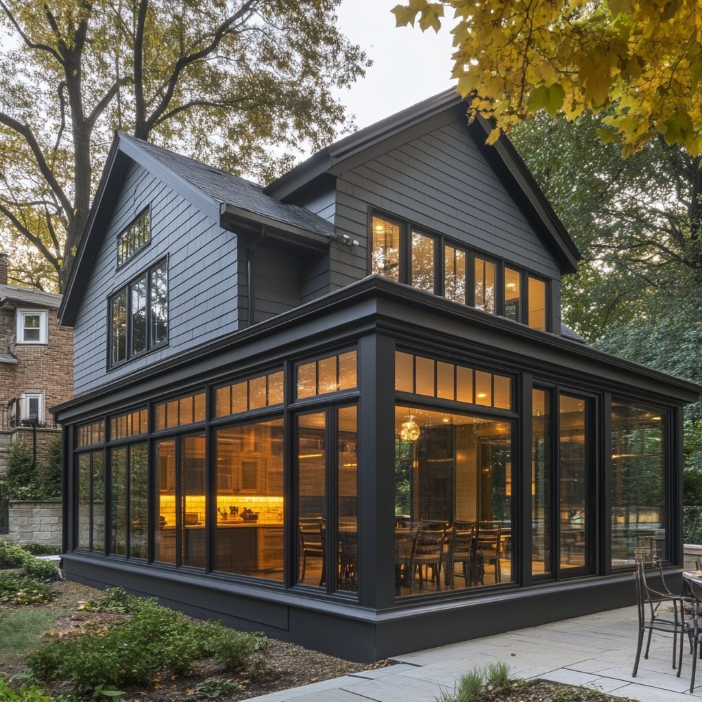 Создано на основе запроса: Exterior photo of a bump-out home addition extending a dining space off the kitchen, with large windows and