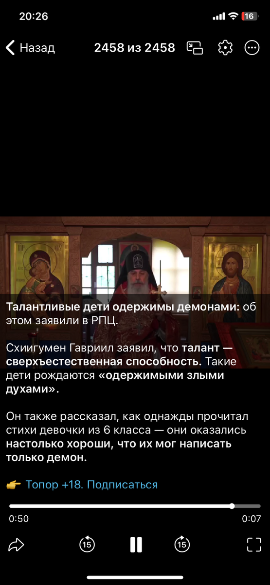 Такое видео прислала мне подружка в Телеграм. Я сделала его скриншот. Наверное, читается не очень хорошо. Суть такова - человек может быть талантливым, но талант этот будет только от демонов)) А я слышала выражение «Боженька в темечко поцеловал». По логике этого священнослужителя Бог ничем хорошим одарить не может. Вот это вера в Бога👍 Просто испанский стыд какой-то. За помощью обращаться на почту veritymagic@yandex.ru. Решаю не только магические, но и психологические проблемы. Провожу диагностику всех сфер жизни. Не диагностирую и не открываю «магический дар». Не работаю с бесами и кладбищем. Не провожу деструктивных воздействий (за приворотом и порчей не ко мне).