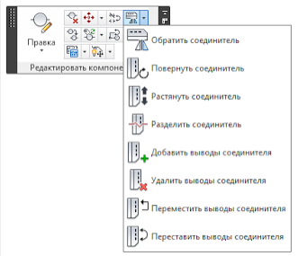 На любом этапе проектирования пользователь может отредактировать размещенные соединители: изменить их ориентацию, разбить на части, добавить или удалить выводы. Инструменты редактирования соединителей размещены в выпадающем списке панели «Редактировать компоненты» вкладки «Схема» ленты. Добавить выводы соединителя Инструмент Добавить выводы соединителя служит для добавления выводов в размещенный на чертеже соединитель. После запуска команды указывается соединитель, в командной строке для выбранного соединителя отображается следующий по порядку (или из списка выводов) номер вывода и указывается место размещения нового вывода. При этом выполняется проверка номеров выводов в родительской и дочерней частях соединителя. При нажатии клавиш С и Enter предлагаемый номер вывода сбрасывается и можно ввести новый номер вывода соединителя. Номера выводов могут состоять из цифр, букв или буквенно-цифровой комбинации. Каждый новый вывод добавляется в заданной точке на одной линии с другими выводами.