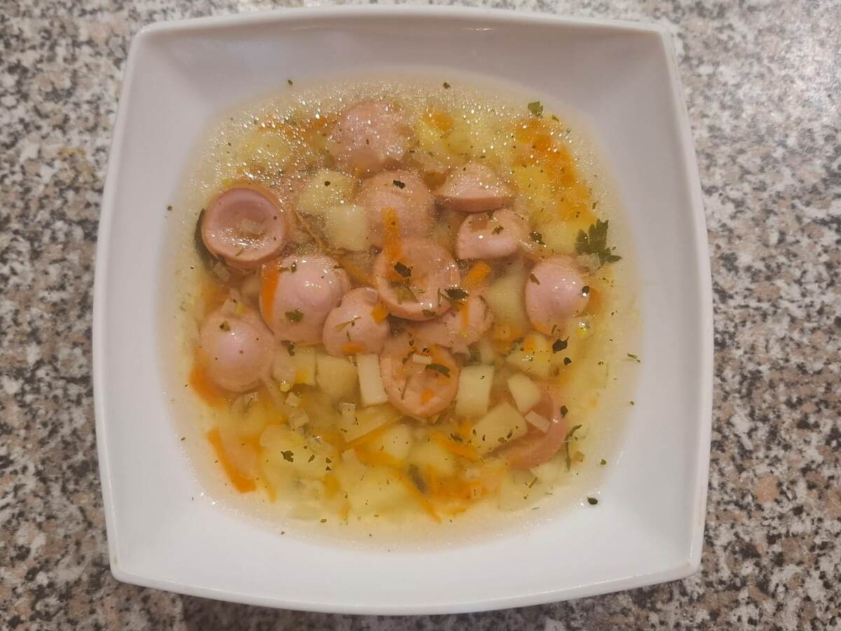 Понадобится: 4 луковицы, 8-10 картофелин,3 литра воды, 1 крупная морковь, 4 ст. ложки растительного масла,6-7 сосисок, соль, перец по вкусу. Лук мелко нарезать.В кастрюле разогреть растительное масло и обжарить на нем лук до лёгкой золотистости.Влить воду,добавить по вкусу куриный бульон «Ролтон» соль и перец,мелко нарезанный картофель. Варить 10 минут. Морковь натереть на крупной терке,(можно по желанию нарезать корень петрушки, а можно и без него),положить в кастрюлю и варить ещё 10 минут. Сосиски нарезать кружочками и за 5 минут до готовности положить в суп.Положить зелень петрушки и укропа и снять с огня. Приятного аппетита!
