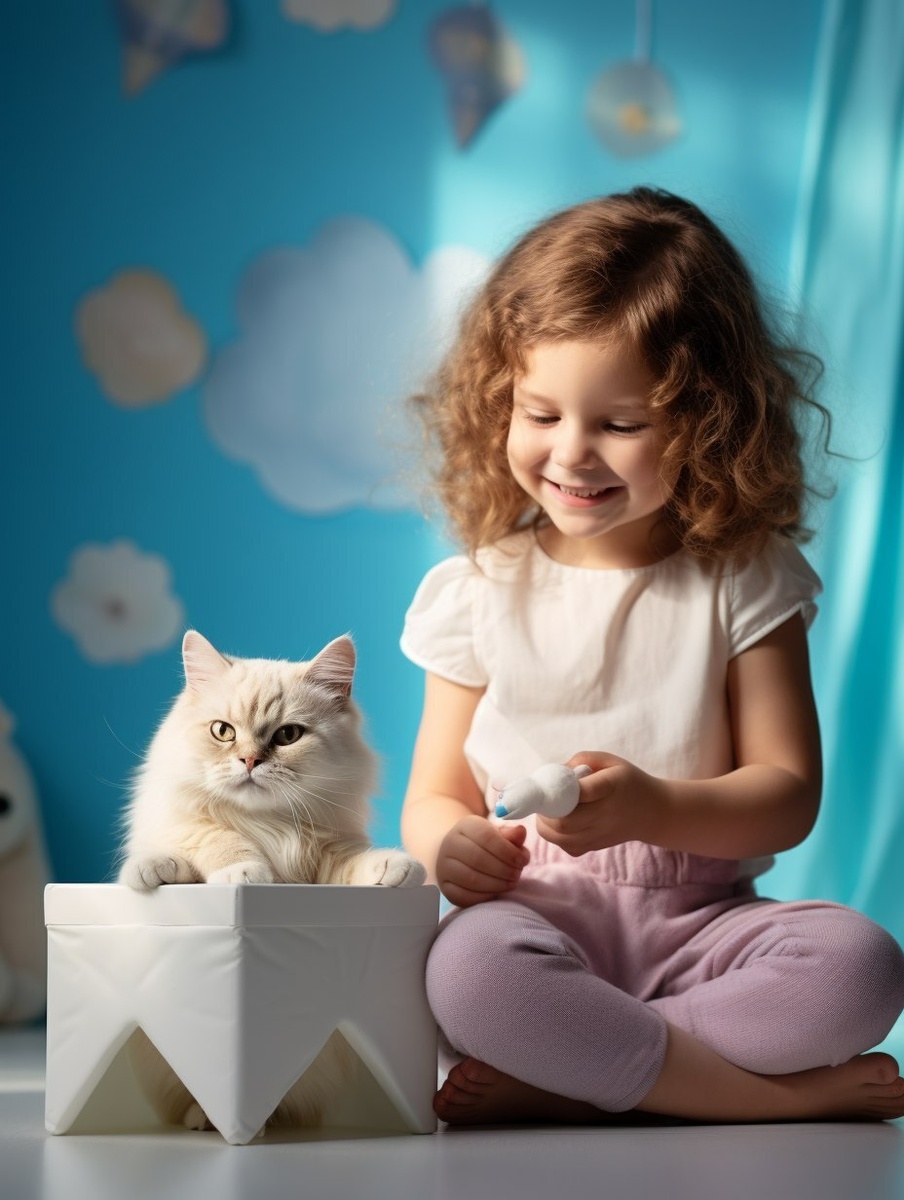 Создано на основе запроса: A cute little girl is playing with her cat smiling happily at each other. The room has blue walls and light-colored floors. There's also a white table nearby. A photorealistic scene captured in the style of Canon EOS R5 using natural light.