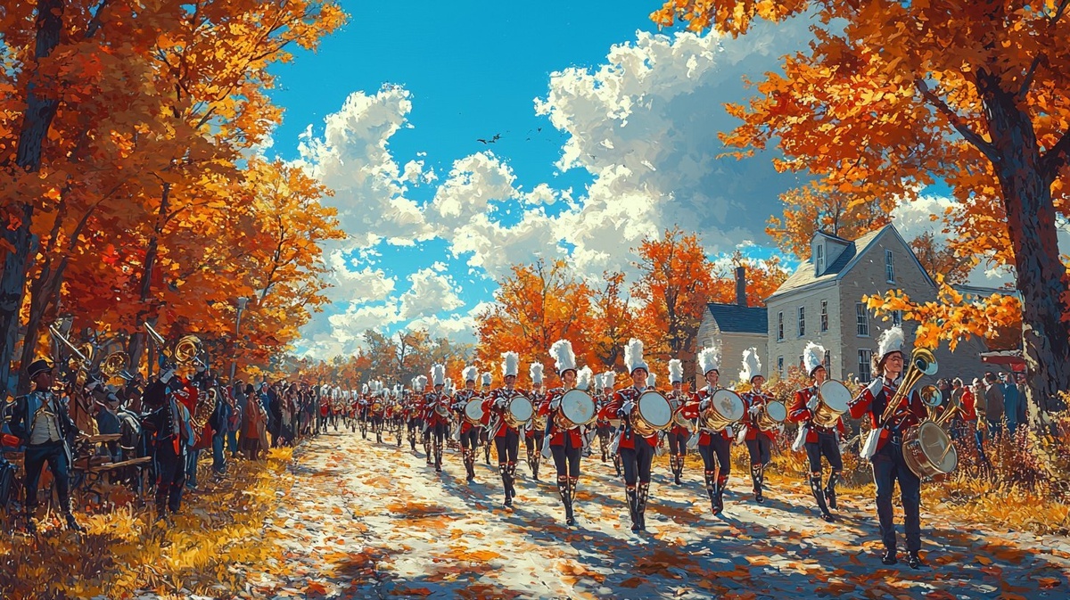 Создано на основе запроса: wide view of a colorful marching band striding in a beautiful park in small town America, sunny day