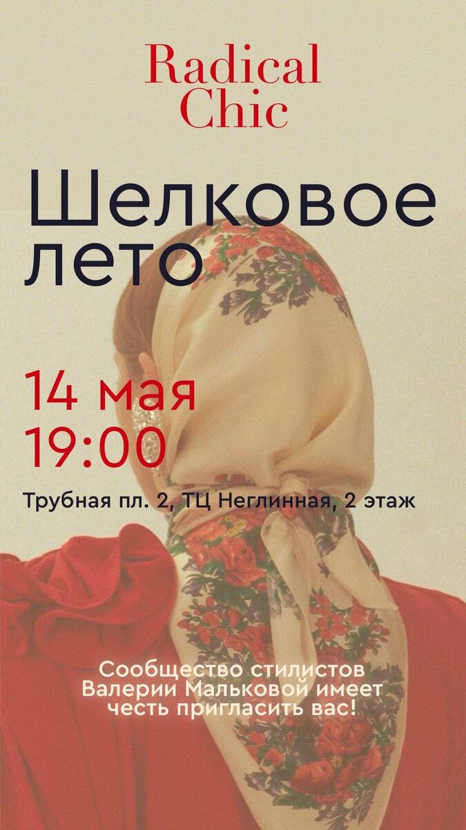 Шелковое лето ☀️ ⭐️ Международное сообщество стилистов приглашает Вас встретить лето вместе! 🪩 14 мая, 19.00 в пространстве бренда Radical Chic (Трубная пл. 2, ТЦ Неглинная, 2 этаж, https://radicalchic.ru/info/magaziny/) пройдет уже традиционное мероприятие в кругу друзей, которое проводит Сообщество Стилистов и бренд Radical Chic Не для кого не секрет, что мы все индивидуальны и каждому из нас нужны "свои " вещи, принты и цвета. Как из всего разнообразия выбирать лучшее вы узнаете на МК 💖 🌸 Количество участников: 20-25 человек Среди них: стилисты, друзья, клиенты Сообщества и партнеры В программе встречи: 🌙 мастер-класс от стилистов по трендам предстоящего сезона 🤍 расскажем о новой коллекции Radical Chic 💅 как выбрать свой идеальный платок и носить стильно 💋 приглашенный гость 🥂Шампанское 🎁 экспресс-консультации от стилистов Сообщества на месте в подарок! 💓Будем рады встрече и дальнейшему сотрудничеству Мест не так много, не затягивайте с регистрацией и бронью: