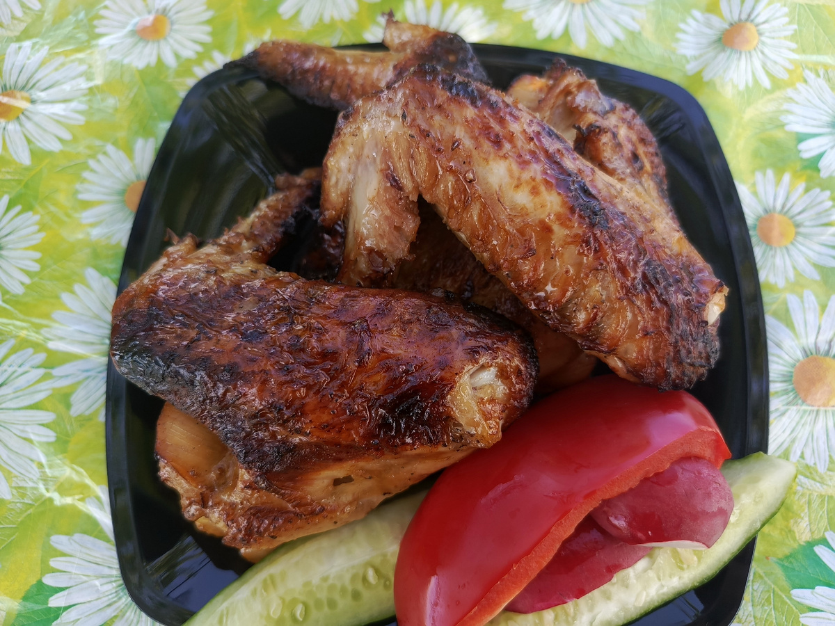 "Крылышки" Ингредиенты: 2 кг.крыльев 1 литр соевого соуса 2 столовых ложки мёда 2 столовых ложки горчицы 0,5 чайной ложки соли 1 чайную ложку чёрного молотого перца 1 большую луковицу Смешать соевый соус , мёд, горчицу. Крылья посолить, поперчить. Добавить порезанный полукольцами лук . Залить всё соевым соусом, оставить мариноваться 2-3часа . Жарить на мангале или в духовке . Вкусные крылышки по лёгкому рецепту!