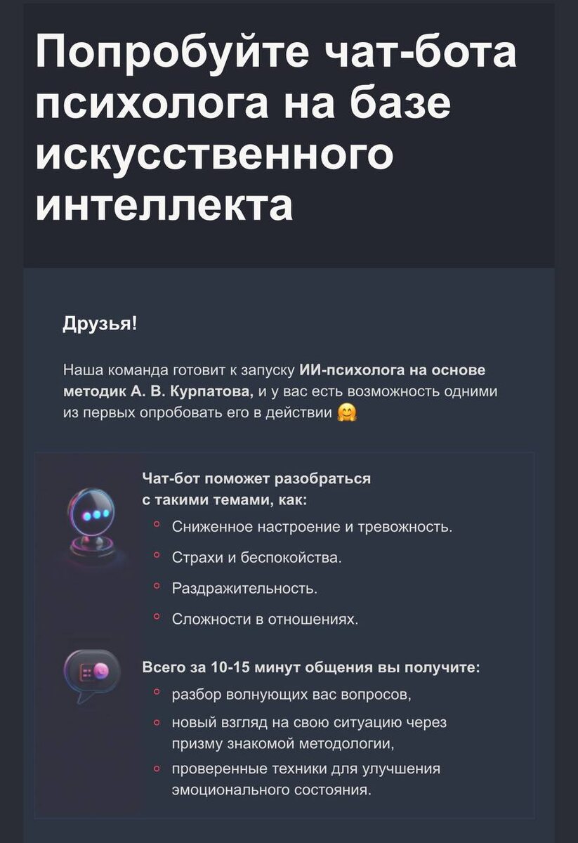 Друзья, ну вот и на нашу голову свалилось ИИ. Хотите опробовать ИИ в действии психологического консультирования? Пишите в комментариях +, кто хочет принять участие в тесте. Отправим ссылку. Ну а потом по дискутируем об опыте )