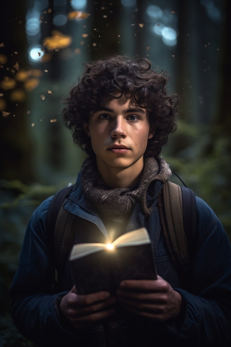 Автоперевод: Портрет вдумчивого молодого человека с темными вьющимися волосами и мягкой улыбкой, биолюминесцентными веснушками, несущим изношенным журналом, нежной атмосферой, лесом, светящимся грибком светом