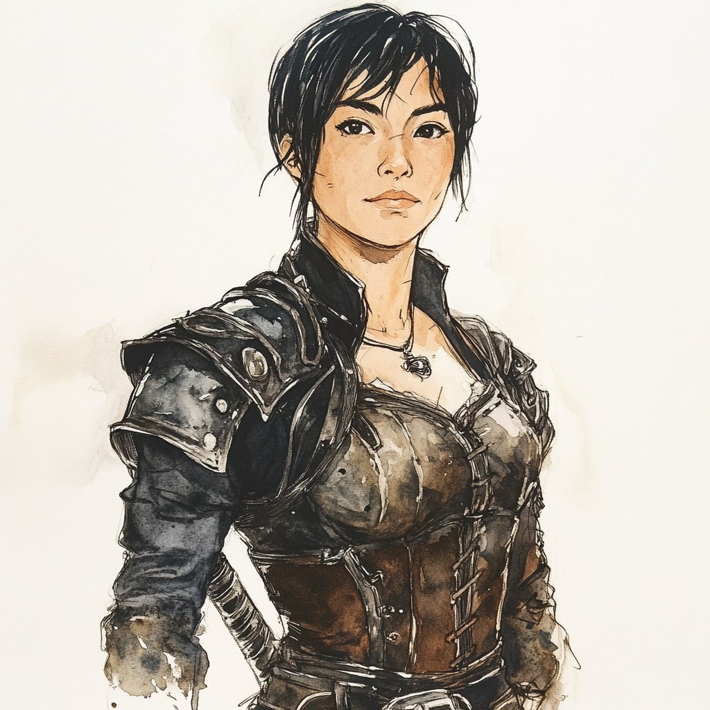 Создано на основе запроса: ink and watercolor drawing, asian woman pirate with short boyish black hair, wearing leather armour