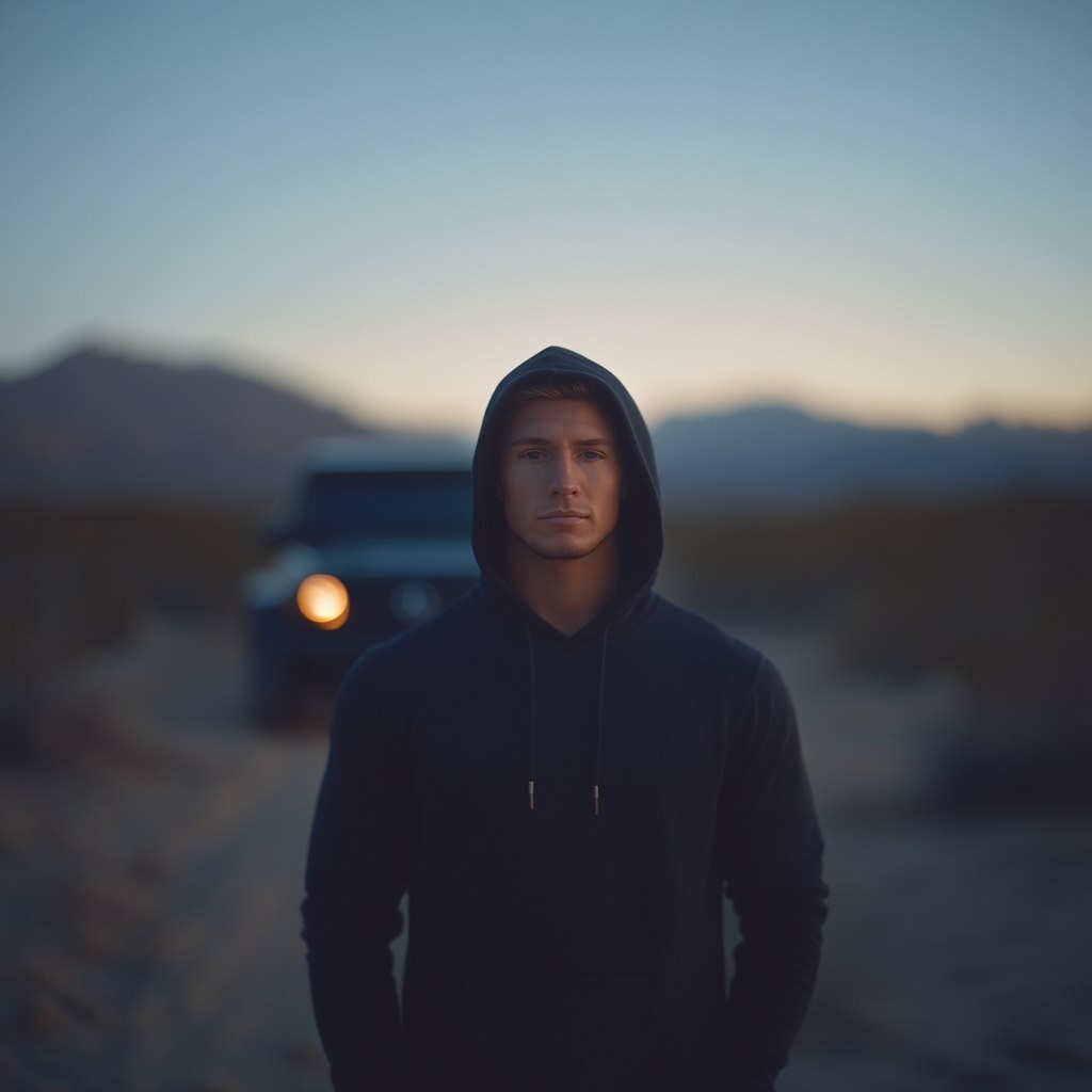 Создано на основе запроса: rugged young man wearing hoodie outdoors clothes portrait desert with amg g63 2025 mercedes in background depth