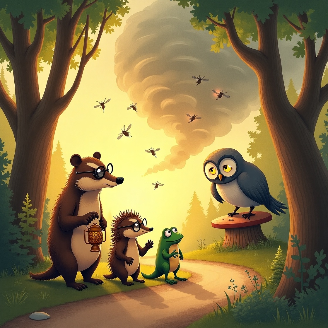 "Дедушка Терентий, а правда, что когда-то на наш лес нападали тучи саранчи?" — спросил как-то бельчонок Пуфик, разглядывая старые зарубки на дубе. Барсук отложил книгу (вернее, гриб-дождевик с надписями), поправил очки и начал рассказ… Лето выдалось жарким. В один душный полдень небо потемнело — но не от туч, а от миллиардов крыльев прожорливой саранчи. — Саранча! — закричала сова Ульяна. — Они съедят все листья, всю кору, даже краску с мухоморов! Среди лесного народа поднялась страшная паника: бобры хлопали хвостами, - но прихлопнуть зловредную саранчу никак не удавалось; ёжики сворачивались в клубки — саранча просто перекатывалась через них: даже филин Ух охрип, отпугивая насекомых. Терентий созвал совет в своей норе: