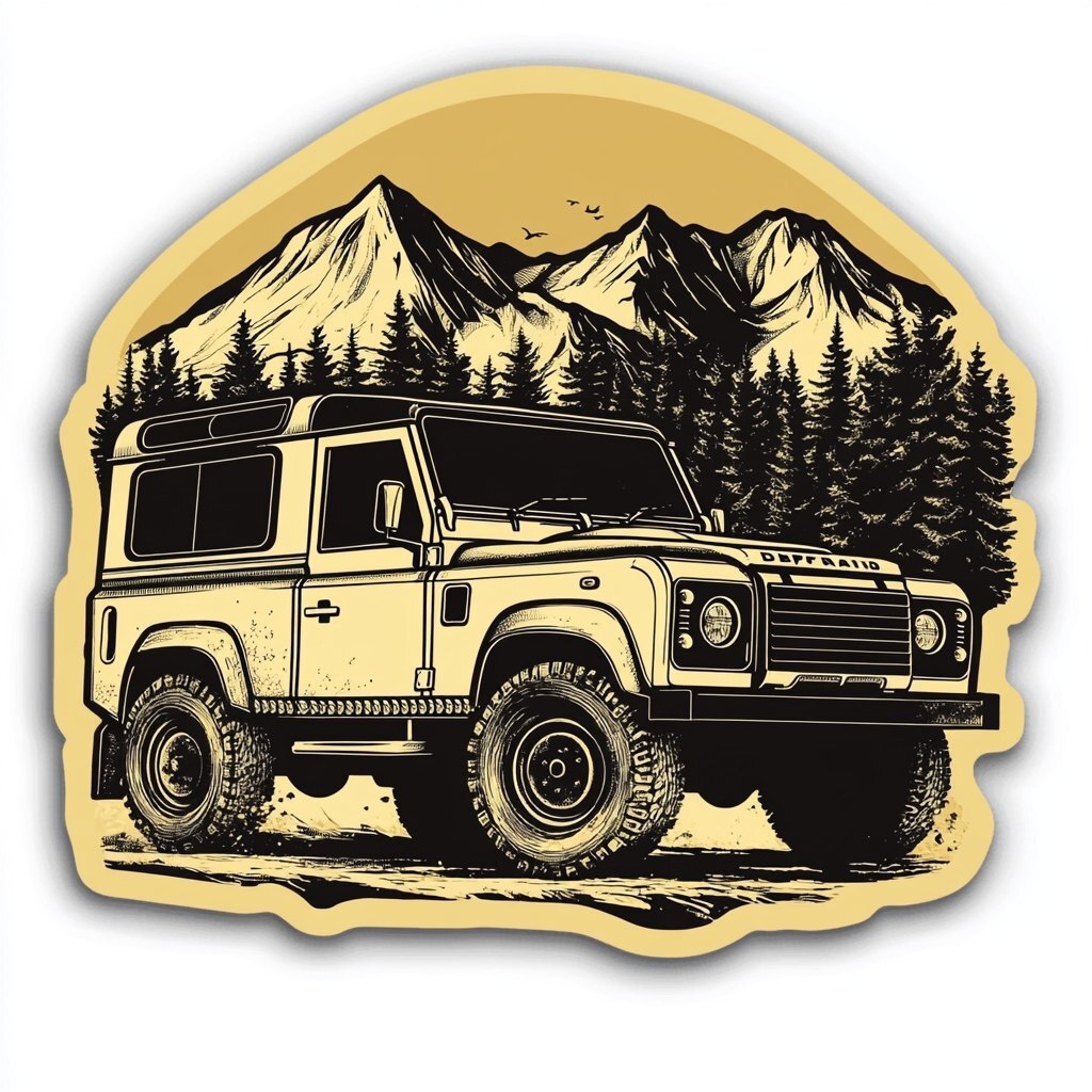 Создано на основе запроса: gold sticker design with drawing in black of Land Rover Defender 110 driving through Blue Ridge mountains with it