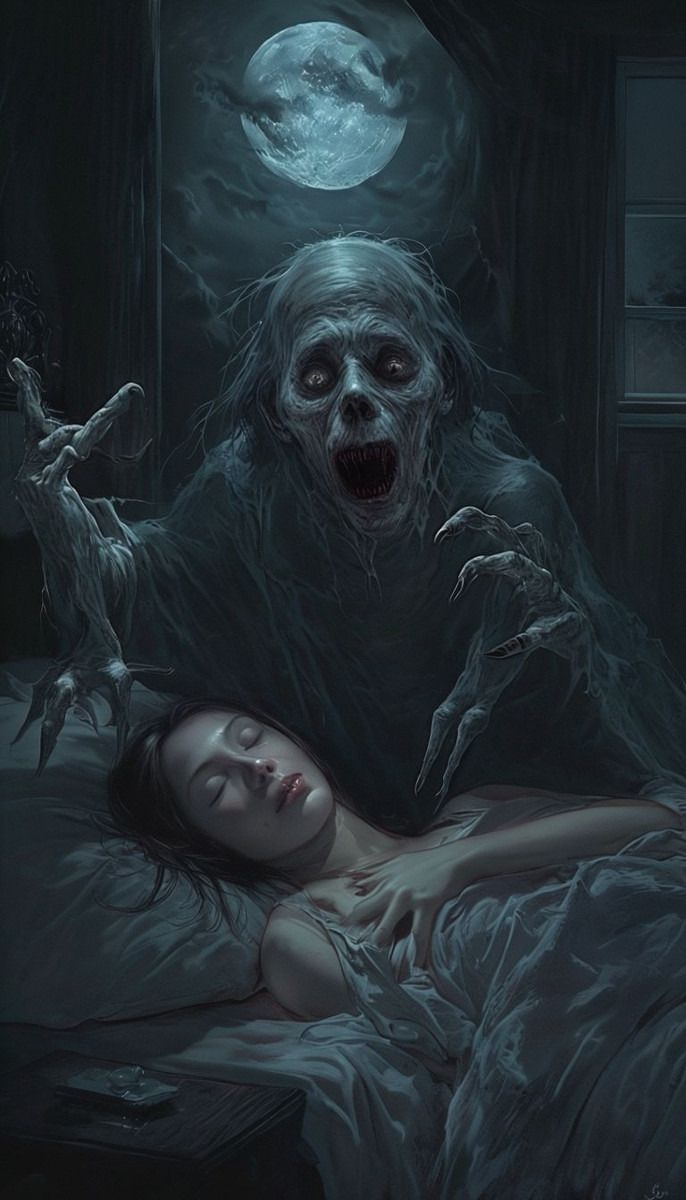 Его пальцы впились в мои плечи — холодные, как могильный камень. В отражении я наконец разглядела его лицо: гниющие губы, обнажённые зубы, пустые глазницы, в которых копошились чёрные жучки.