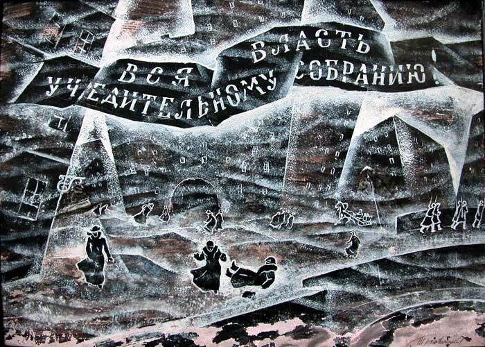 В-третьих, цвета тоже поставлены на противопоставлении и сопоставлении. В поэме фигурируют три основных цвета: черный, белый и красный. Черный цвет символизирует «старый» мир, а белый – «новый», который связан с надеждой на лучшее. Красный сопоставляется с кровью, пролитой за изменения в жизни, поэтому флаг из красного становится кровавым.