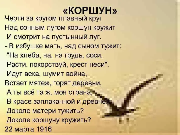 Стихотворение «Коршун» (1916) Александра Блока — лаконичное, но ёмкое произведение, наполненное тревожными предчувствиями. Написанное за год до революции, оно отражает размышления поэта о судьбе России, её исторических циклах и неотвратимости рока. Образ коршуна, парящего над бескрайними просторами, становится метафорой гибели, нависшей над страной. Стихотворение рисует мрачную картину: коршун медленно кружит над бедными деревнями, бескрайними полями и лесами. Его полёт неспешен и неумолим, словно сама смерть. Герой наблюдает, как птица «чёрным венцом» венчает «дольний» (земной) мир, а её тень накрывает нищих крестьян, «мать над ребёнком», «долгие песни полей». Финал звучит как приговор: «Идут века, шумит война,