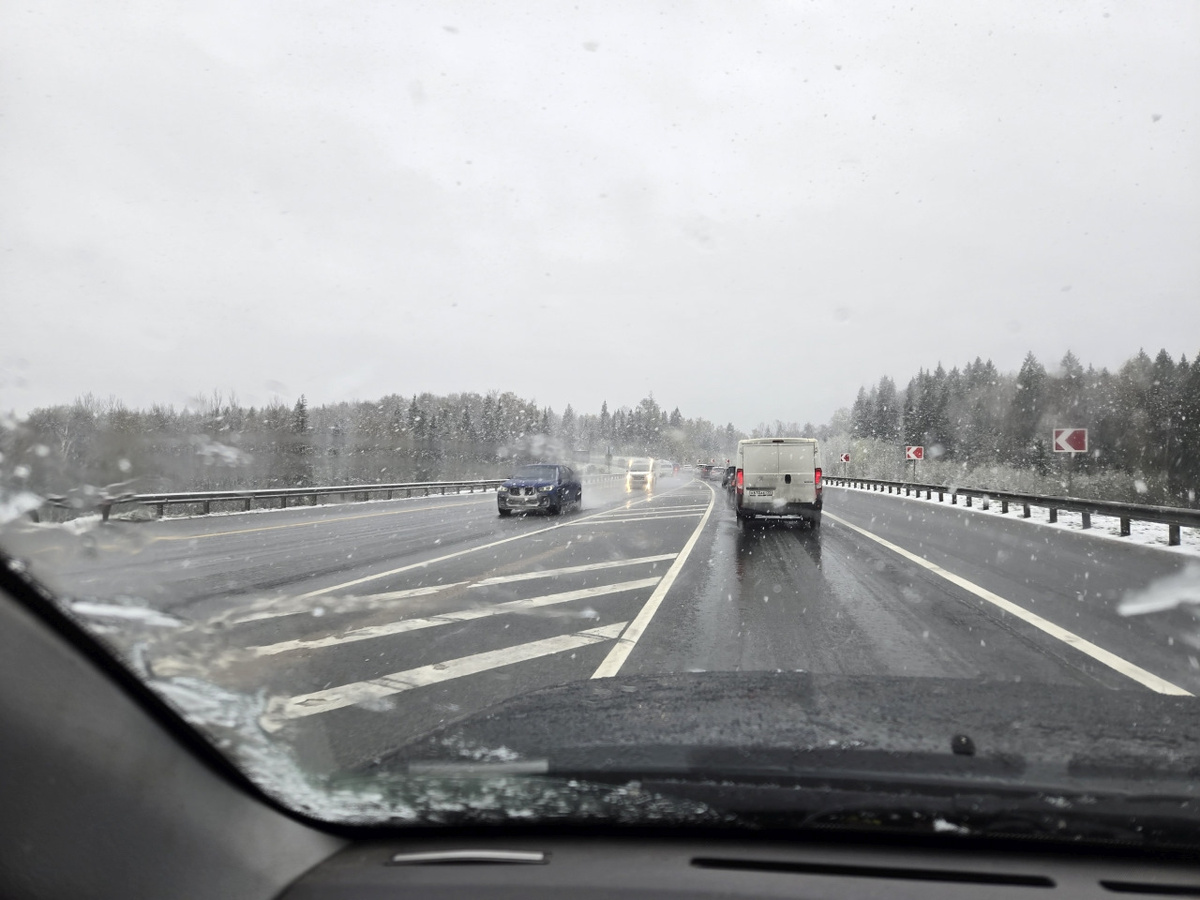 На Ярославском шоссе пришлось постоять в пробках из-за ремонтов дорог и ещё раз подумать, что надо было выезжать в 4:30 или ещё раньше. А после Сергиева Посада ливень внезапно испытал фазовый переход и превратился в снегопад! Пробки из-за него усугубились.