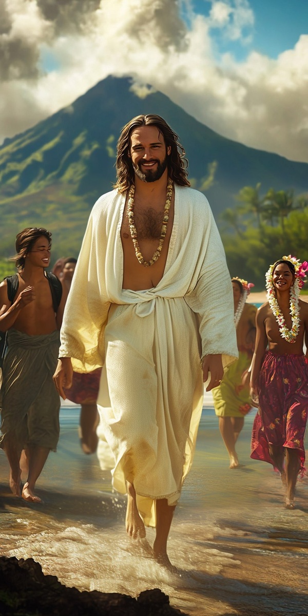 Автоперевод: Переход на библейский халат, а не в халат с драматическим освещением, фотореалистический Иисус с короткими волосами, одетый в белую одежду с длинными рукавами, прогуливается по гавайскому пляжу с горой Килуи на заднем плане с одной скромно одетой счастливой женщиной с цветами в волосах и одним мужским колледжем колледжа.