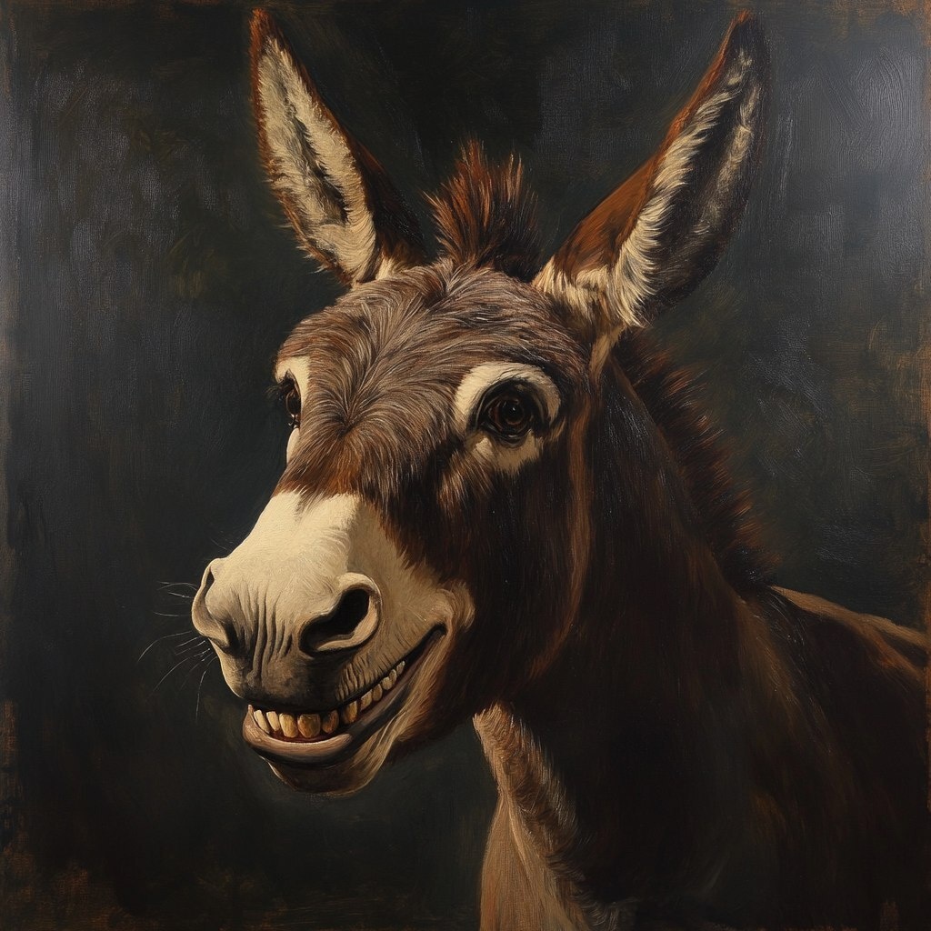 Создано на основе запроса: a classical colonial style oil painting of a donkey with a very condenseding smile