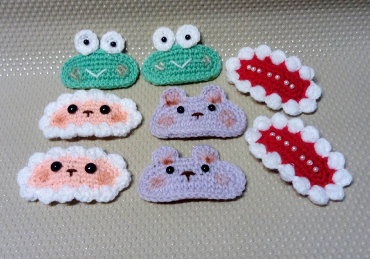 Здравствуйте . Хочу предложить вам связать вместе со мной вот такие симпатичные заколочки клик-клак . Заколки клик-клак одни из самых доступных и недорогих аксессуаров для волос . Однако их изнаночный вид нравится далеко не всем. Сделать на основе таких заколок авторские совсем не сложно. Дизайн можно выбрать любой – как для взрослых, так и для детей. Заколочки , просто очаровывают и притягивают восхищённые взгляды . Изначально вязать я начала только один вариант , для моей младшей дочки . Но мой внутренний ребёнок , тоже стал требовать и для себя. Потому что в моём детстве , таких милашек точно не было 😭 . Да и старшая дочурка была не против , получить пару таких заколок . Ну и тут меня понесло. Предлагаю вашему вниманию четыре варианта . У всех вариантов она одинаковая . В конце обрежьте и закрепите нить . Приложите к фетру основную часть , обведите её , вырежьте. На две заколки потребуется по две таких заготовки . При желании можно подобрать фетр похожий по цвету или испол