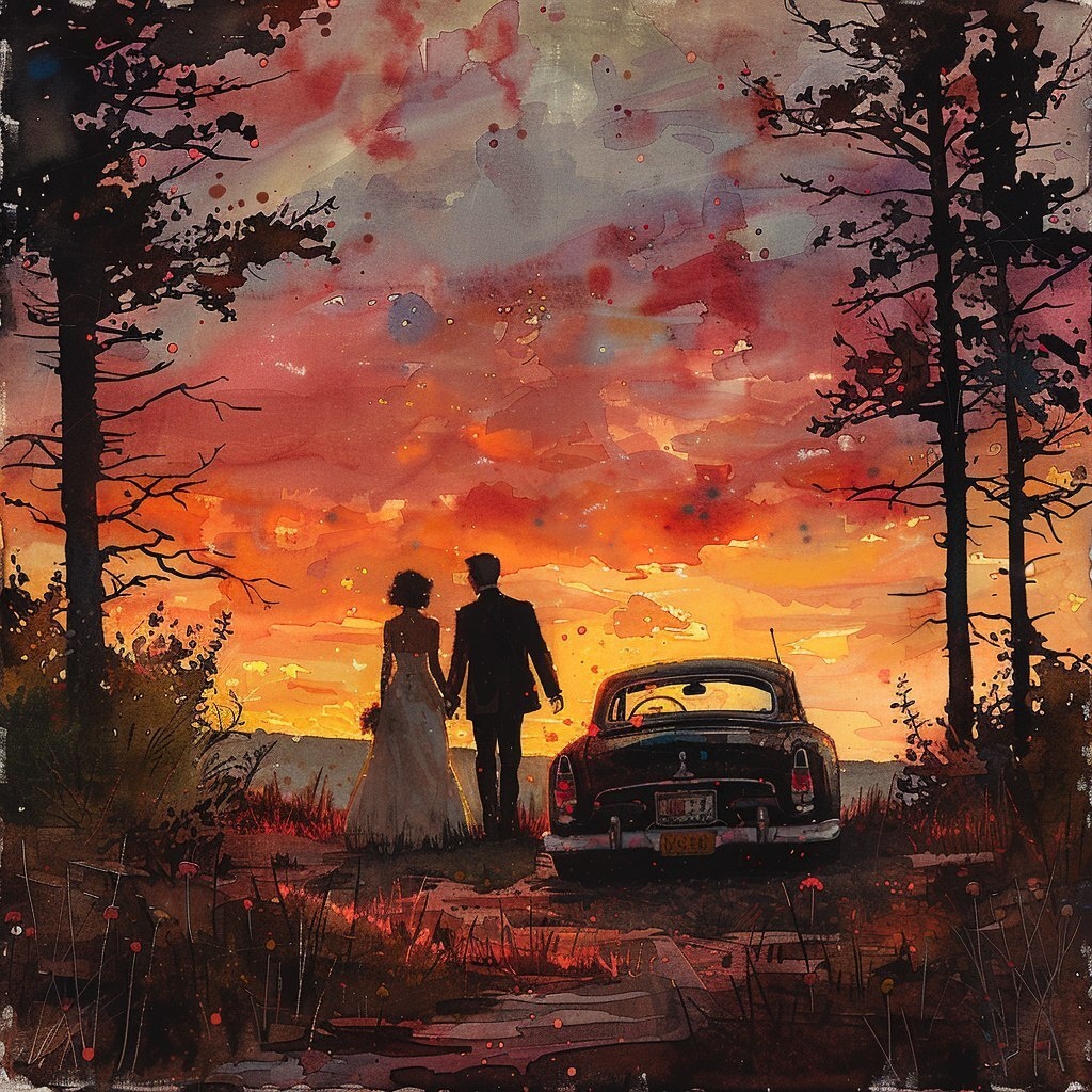 Создано на основе запроса: Couple sunset silhouette with 'just married' car, watercolor peach and violet sky, solid silhouette