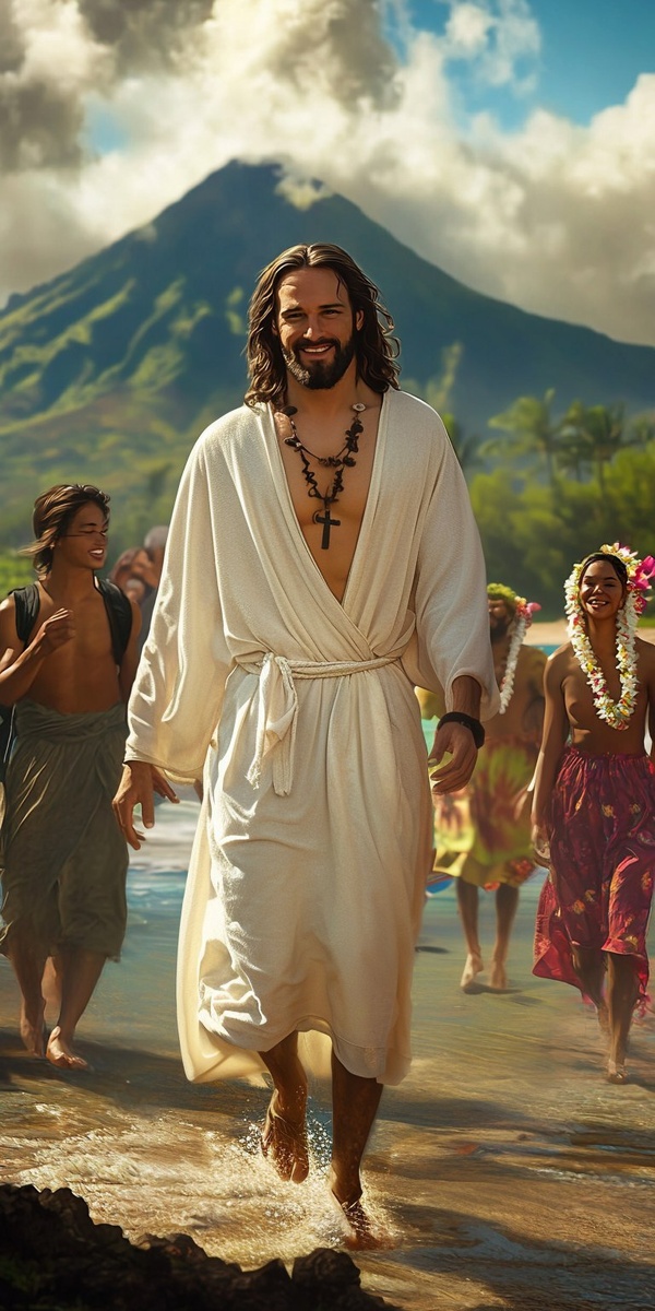 Создано на основе запроса: change to a pullover robe, not a bathrobe with dramatic lighting, a photorealistic Jesus with short hair, wearing a long-sleeved white robe, walks along a hawaiian beach with mount kiluea in the background with one modestly dressed happy female with flowers in her hair and one male polynesian college students --- Автоперевод: переключиться на пуловерную одежду, а не халат с драматическим освещением, фотореалистический Иисус с короткими волосами, одетый в белую одежду с длинными рукавами, ходит по гавайскому пляжу с горой Килуа на заднем плане с одной скромно одетой счастливой женщиной с цветами в волосах и одним мужчинам-студентами колледжа. Неплохо выглядит? 🤔 https://dzen.ru/id/65c0c65c86e4f837c27b24d7 #ИИ #AI #нейросеть #midjourney #art