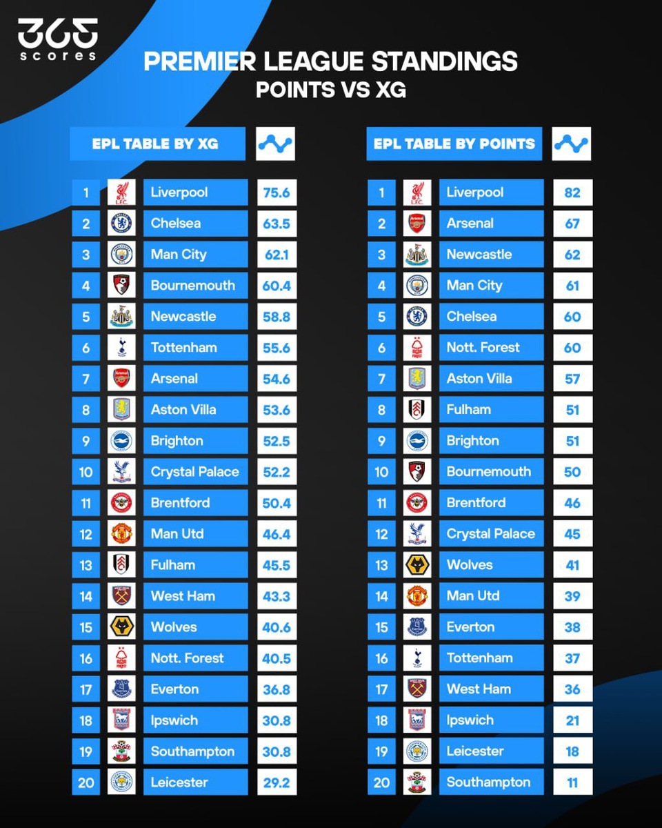 В матче 34-го тура АПЛ «Ливерпуль» со счетом 5:1 разгромил «Тоттенхэм» и досрочно оформил чемпионство – это 20-й титул мерсисайдцев в высшем дивизионе чемпионата Англии. За 34 матча подопечные Арне Слота заработали 82 очка. Следом идет «Арсенал», в копилке которого 67 очков, а замыкает тройку «Ньюкасл», которому удалось набрать 62 балла. Портал 365 Scores, специализирующийся на футбольной статистике, составил альтернативную таблицу Премьер-лиги: команды расположили по показателю xG. «Ливерпуль» при таком раскладе сохраняет первую строчку, вторым становится «Челси», а следом идет «Ман Сити». «Борнмут» перескочил с десятой позиции на четвертую. «Арсенал» потерял второе место и опустился на седьмую позицию – «канониры» по xG уступили «Тоттенхэму», который в реальности лишь 16-й. А вот «Ноттингем Форест» в альтернативной таблице опускается на 16-ю строчку вместо шестой. «Ман Юнайтед» по xG поднимается на две позиции, а «Ипсвич», «Брентфорд» и «Брайтон» занимают одинаковые места в двух табл