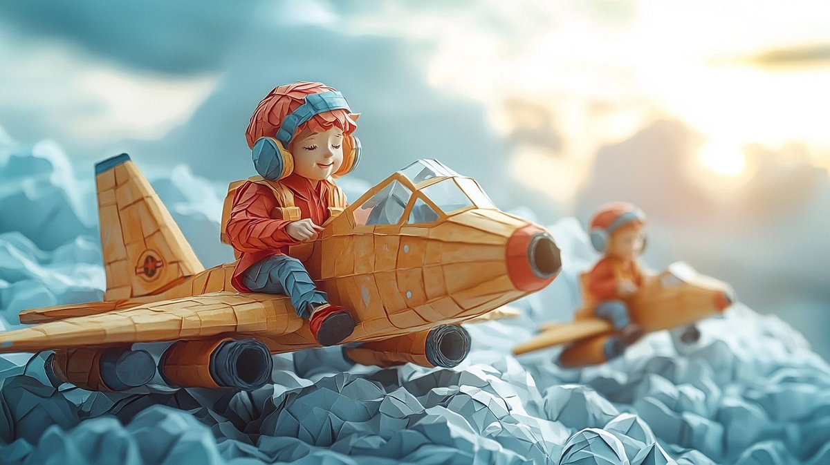 Создано на основе запроса: colorful kids playing on a military jet converted to a playground toy on a sunny day, style of paper art