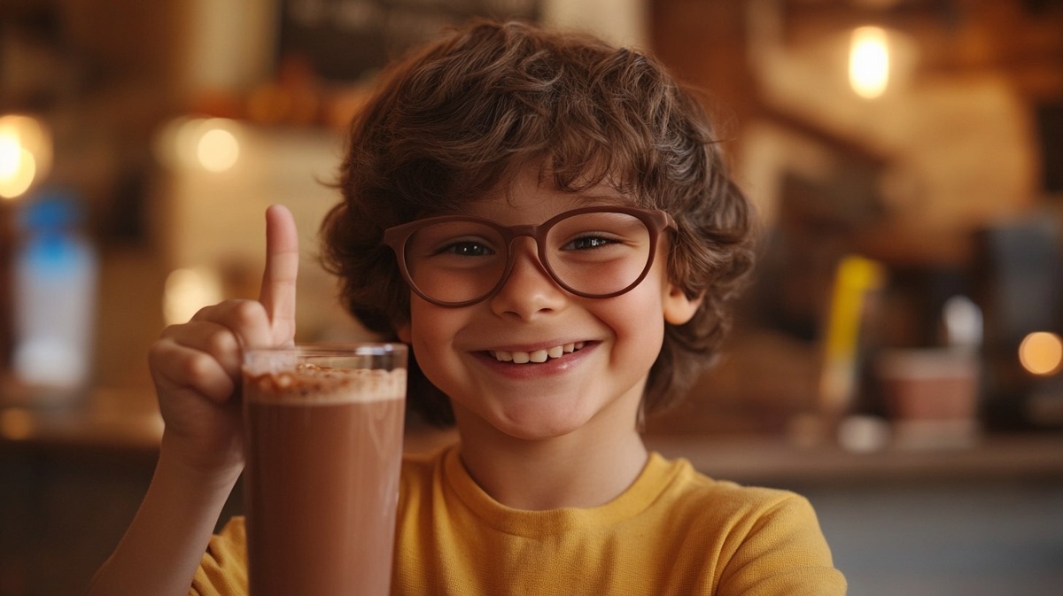 Создано на основе запроса: a smiling kid, driking chocolate milk, with approve gesture