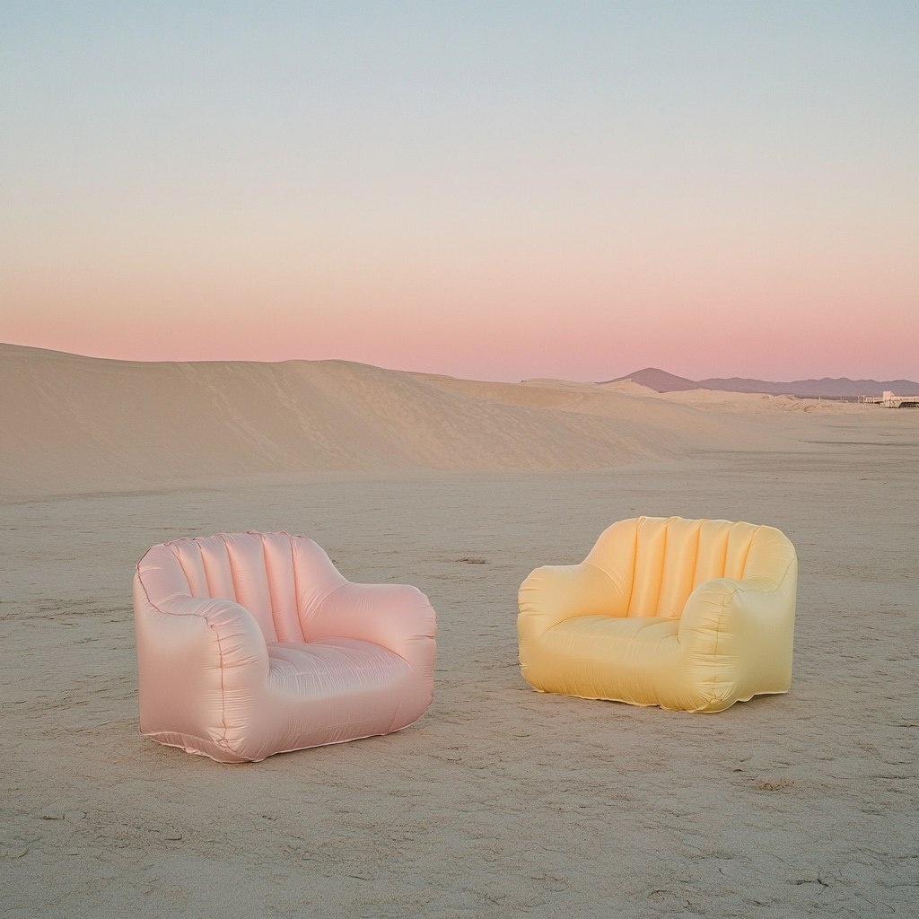 Создано на основе запроса: two inflatable chairs sitting in the desert in jacquemus style and ivan alifan style with pastel colors