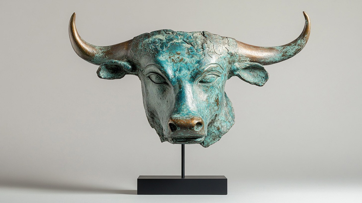 Создано на основе запроса: A bronze mask depicting the head and horns of an ancient bull from 3000 BC is displayed in front view against a gray background. The mask is made of glossy green copper with some blue details and has some cracks and breakage from time erosion. It has well-defined facial features such as eyes, nose, mouth, and ears, with no hair or beard. The mask is mounted on a black stand that stands out from its base. Shot in a studio with a white background. --- Автоперевод: Бронзовая маска, изображающая голову и рога древнего быка с 3000 г. до н.э., отображается спереди на сером фоне. Красиво получилось? 🤔 https://dzen.ru/id/65c0c65c86e4f837c27b24d7 #ИИ #AI #нейросеть #midjourney #art
