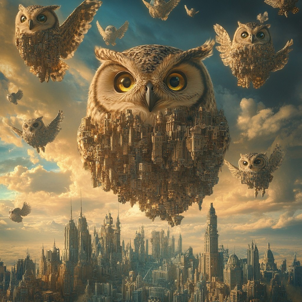 Создано на основе запроса: a city made up entirely of owls in the sky