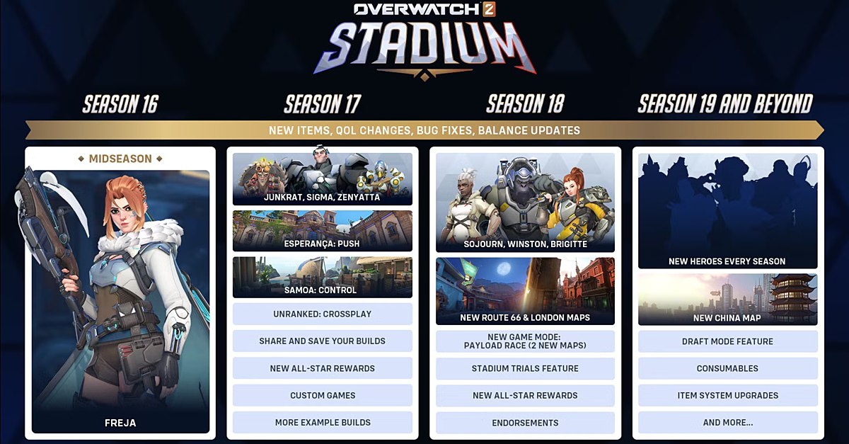 Overwatch 2 представил планы по развитию режима Stadium Ключевые обновления: - Сезон 17 (24 июня): Джанкрат, Сигма, Дзенъятта, карты Эсперанса и Самоа, кроссплей, кастомные игры. - Сезон 18 (август–сентябрь): Соджорн, Уинстон, Бригитта, новый режим Payload Race, квесты, система похвалы. - Сезон 19 (октябрь): новая карта «Китай», драфт-режим, предметы и улучшения системы вещей. Blizzard обещает, что все будущие герои будут добавляться в Stadium — если темп сохранится, полный ростер будет доступен к августу 2026 года.