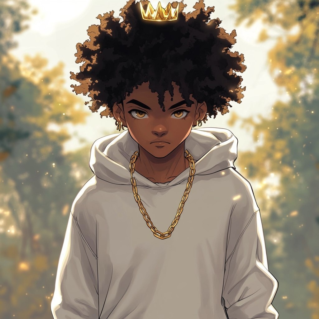 Создано на основе запроса: A young anime Black boy, around 15 years old, with warm golden-brown skin and thick, coiled natural hair in a soft rounded afro. He has large, expressive eyes conveying deep emotion and wisdom beyond his years. He wears an oversized cream or off-white sweatshirt, loose earth-toned pants, and a chunky gold chain around his neck. Black shoes On his head rests a simple, softly glowing five-point crown, full body image, including his shoes, in nature background --- Автоперевод: Молодой черный мальчик аниме, около 15 лет, с теплой золотисто-коричневой кожей и густыми, натуральными натуральными волосами в мягком округленном афро. Как тебе такое изображение? 🤔 https://dzen.ru/id/65c0c65c86e4f837c27b24d7 #ИИ #AI #нейросеть #midjourney #art