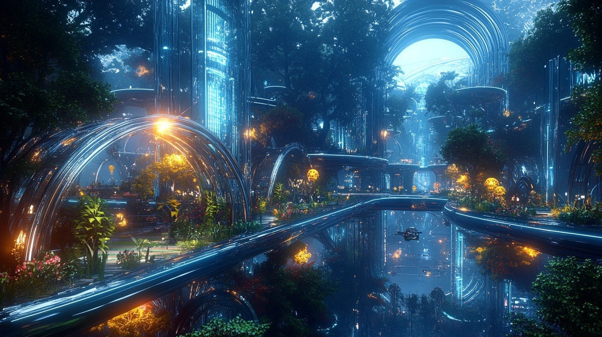 Создано на основе запроса: Utopian cybernetic city, sleek chrome and glass architecture, illuminated parks and skybridges, glowing lights