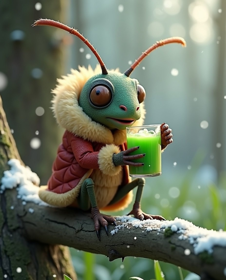 Морозным утром, когда снег мягко укутывал лес, по заснеженной тропинке шел таракан Фёдор в своей нарядной овчинной бекеше. Шапку он сегодня забыл — торопился на зимнюю прогулку, — поэтому уши подмерзли, но бодрости не терял.