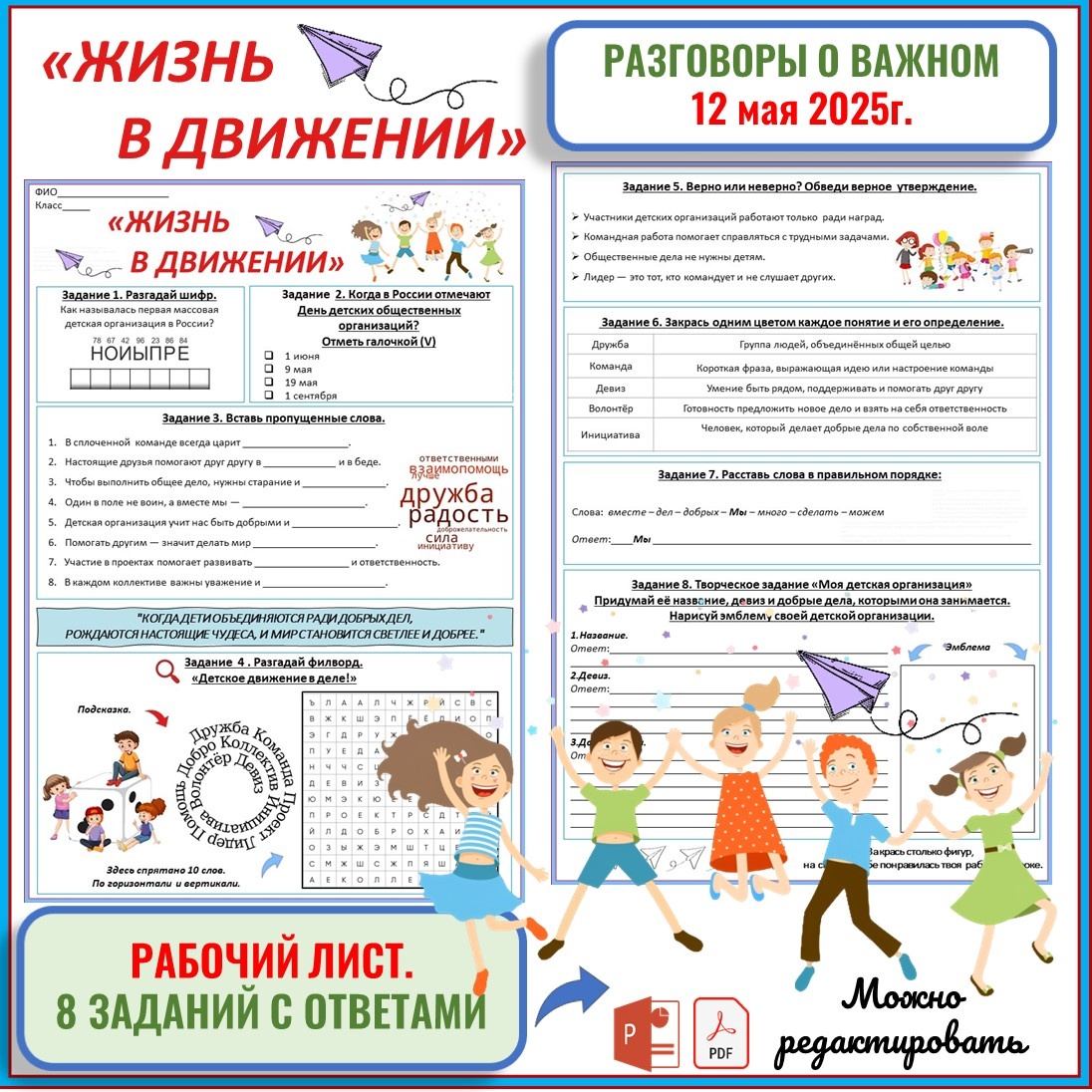 Ознакомиться и скачать можно ЗДЕСЬ Рабочий лист Разговоры о важном "Жизнь в Движении" 12 мая 2025 г. Разработан для 2-4 кл.С ответами для учителя, можно редактировать. В рабочем листе 8 заданий + ответы для учителя. Задание 1.Разгадай шифр. Задание 2. Когда в России отмечают День детских общественных организаций? Отметь галочкой (V) Задание 3. Вставь пропущенные слова. Задание 4. Разгадай филворд. Задание 5. Верно или неверно? Обведи верное утверждение. Задание 6. Закрась одним цветом каждое понятие и его определение. Задание 7. Расставь слова в правильном порядке: Задание 8. Творческое задание «Моя детская организация» Придумай её название, девиз и добрые дела, которыми она занимается. Нарисуй эмблему своей детской организации. Рефлексия. Задания размещены на 2-х листах . ( желательно использовать двухстороннюю печать для экономии бумаги). Приглашаю Вас посмотреть другие мои работы : Год защитника Отечества 2025. Оформление: речевые облачка и плакат. Рабочие листы пополняются новыми