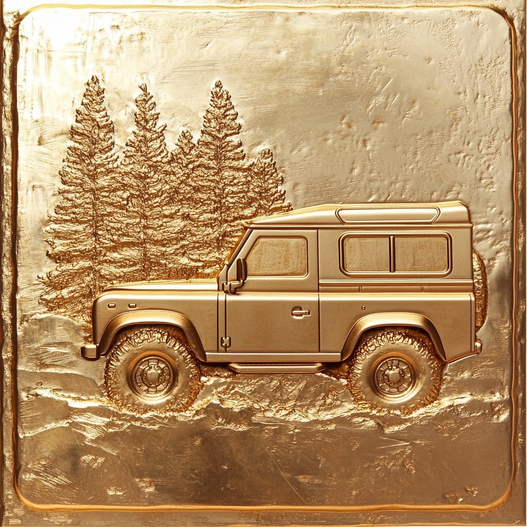 Создано на основе запроса: gold tile with Land Rover Defender 100 embossed in gold with woods in gold