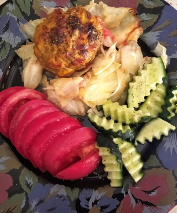 Для фрикаделек: ✔ Фарш (у меня – куриный) – 250 г; ✔ Лук – ½ некрупной луковицы; ✔ Овёс варёный (можно запаренные овсяные хлопья) – 3 ст. л.; ✔ Соль, перец – по вкусу. Овощи: ✔ Капуста белокочанная - 350 г; ✔ Помидоры - 1 шт.; ✔ Шампиньоны - 2 шт. (можно без них); ✔Специи для овощей – по вкусу. Соус: ✔ Яйцо куриное - 1 шт.; ✔ Сыр творожный – 2 ст. л.; ✔ Кетчуп – 2 ст. л.; ✔ Масло растительное - 1 ч. л.; ✔ Соль, специи - по вкусу. Лоток для запекания (у меня – керамический) смазать маслом. Выложить капусту: можно мелко нашинковать, можно пластинами толщиной в 1 см. Капусту можно предварительно бланшировать, тогда она получится мягкой. Если не бланшировать, то получится «аль денте», но соусом пропитается так же. Слегка посолить, присыпать специями для овощей. Помидор нарезать и выложить поверх капусты. Следом – измельчённые грибы. В фарш (у меня уже готов -лук, специи) добавить три ложки отварного овса. Перемешать, сформировать тефтельки, и выложить их на овощи. Готовим заливку. Яйцо, тв